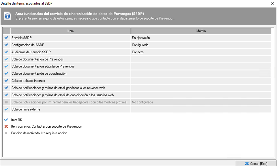 - Incidencias Servicio SSDP. Dispone de una serie de items que se marcarán con una "X" roja en el caso de que haya error en algún área funcional del Servicio SSDP. Si existe algún error, el recuadro aparecerá en rojo indicando el número de errores. Contacte con soporte de Prevengos si hay algún error.