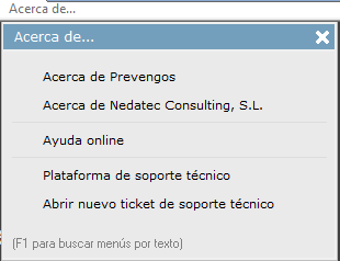 Tenemos dentro de este desplegable las mismas opciones que veíamos en el apartado anterior de Módulos de Prevengos, donde podemos acceder a cada uno de los módulos, así como cerrar sesión o cerrar la aplicación que son los mismos botones que veíamos en el punto anterior.