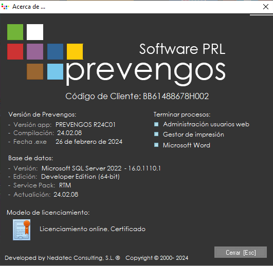 - Acerca de Prevengos. Se muestra una ventana informativa con los datos de compilación y versión de Prevengos. También disponemos de herramientas para finalizar procesos cuando se quedan colgados, como el módulo web, gestor de impresión o el propio Word. Esto último es útil para solucionar aquellas situaciones en los que se generan documentos en blanco, no se inicia correctamente el gestor de impresión o no se puede acceder al administrador web, ya que finaliza aquellos procesos de estas aplicaciones.