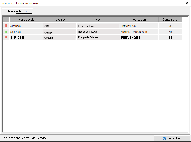 La información sobre el usuario y host, son el nombre del usuario de Windows que arranca el programa y el nombre de su máquina (no es el nombre del usuario interno de Prevengos). El registro en negrita, le indica que ese la licencia que está consumiendo usted. En esta pantalla puede ver que hay sesiones que no consumen licencia como es el caso de las aplicaciones complementarias a Prevengos, como es el 'Administrador web', 'Agenda de citas' e 'Importador de analíticas'.