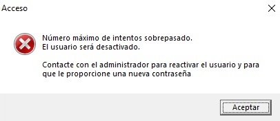 Si un usuario, es desactivado por introducir mal la contraseña tras 3 intentos consecutivos, no podrá acceder a Prevengos hasta que un usuario administrador vuelva a activarle el usuario en Mantenimiento de Usuarios.