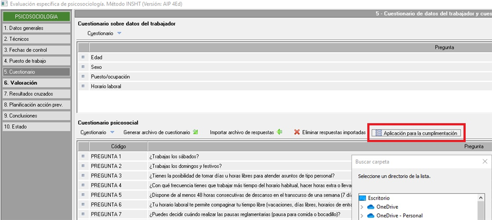 Además, pueden copiar el ejecutable "CuestionarioPS.exe" a cualquier otro directorio o carpeta del equipo directamente desde Prevengos en la pestaña "5. Cuestionario" del estudio psicosocial. Para ello, pulsen sobre la opción "Aplicación para la cumplimentación" y seleccione el directorio o la carpeta deseada.