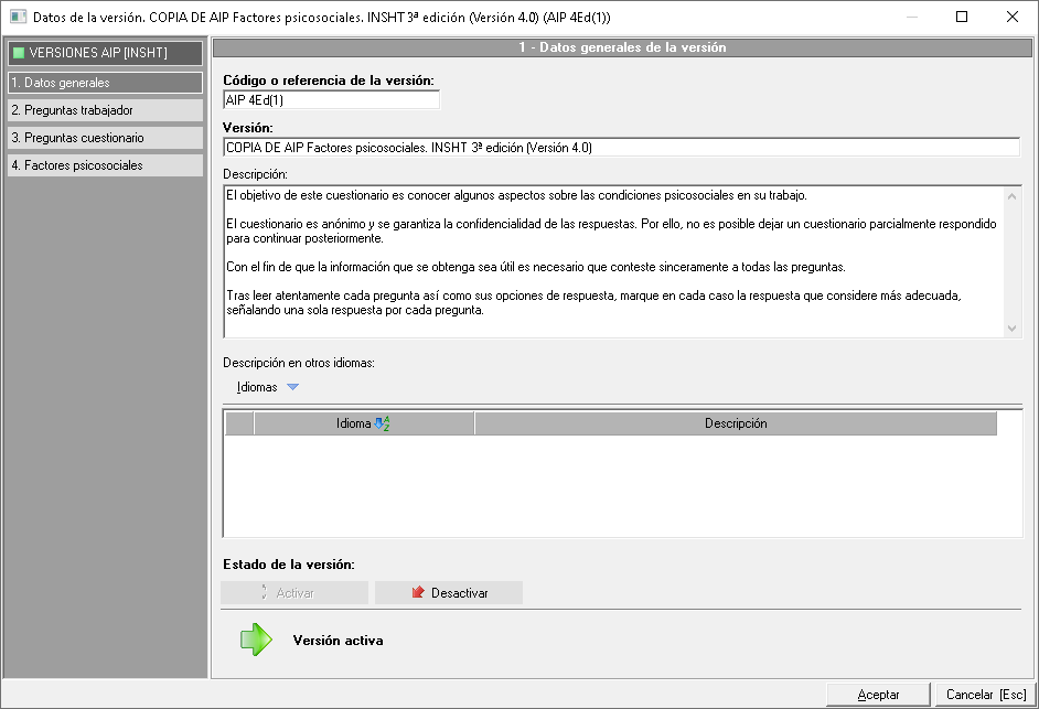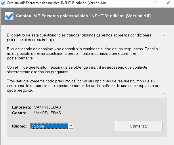 Prevengos permite adaptar los cuestionarios de las evaluaciones psicosociales a cualquier idioma, para la cumplimentación con el fichero CuestionarioPS.exe, y Catalán, Inglés y Portugués, para el portal web o para la urna.