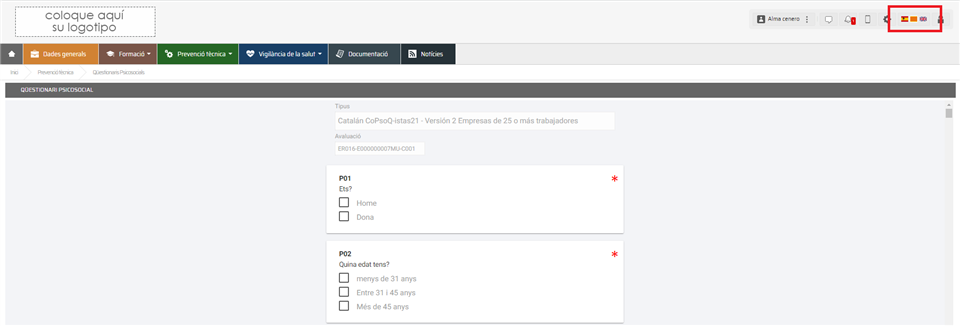 En el caso de la web del trabajador pulsaremos sobre la bandera deseada para que se traduzca el cuestionario. Encontramos las banderas en la esquina superior derecha del navegador: