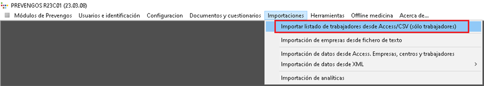 Prevengos dispone de una herramienta para importar trabajadores masivamente desde la pantalla principal con el menú Importaciones > Importar listado de trabajdores desde Acces/CSV (sólo trabajadores), con este enlace descargará la plantilla necesaria, como se indica en la guía Importación de trabajadores desde Access/CSV.