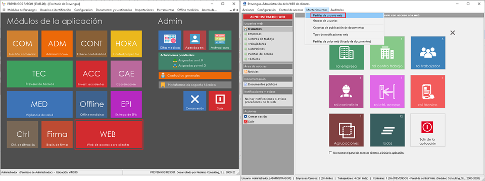 Para que los trabajadores puedan cumplimentar el cuestionario online, han de tener un usuario rol trabajador de esta empresa ficticia. Para ello, acceda al módulo WEB, y antes de proceder a la generación de los usuarios web, creará un perfil para el rol trabajador con acceso sólo a los cuestionarios psicosociales.