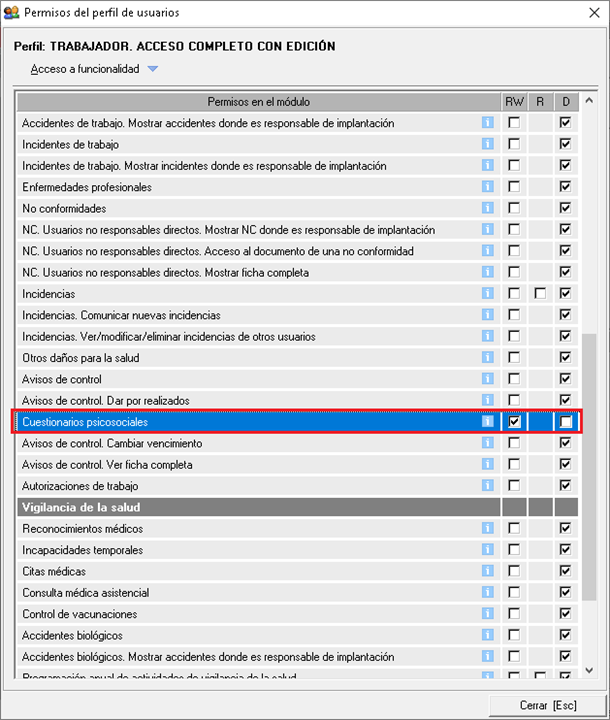 Con el botón Permisos de acceso del perfil [F1] accederá a habilitar el permiso Cuestionarios psicosociales en RW.
