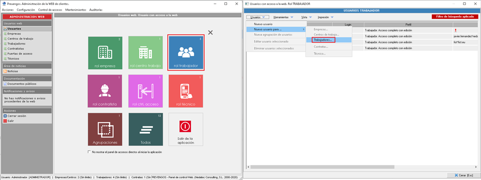 Ahora procederá a crear los usuarios web, para asignarles este perfil, con el acceso rol trabajador y el menú Usuarios > Nuevo usuario para... > Trabajadores.