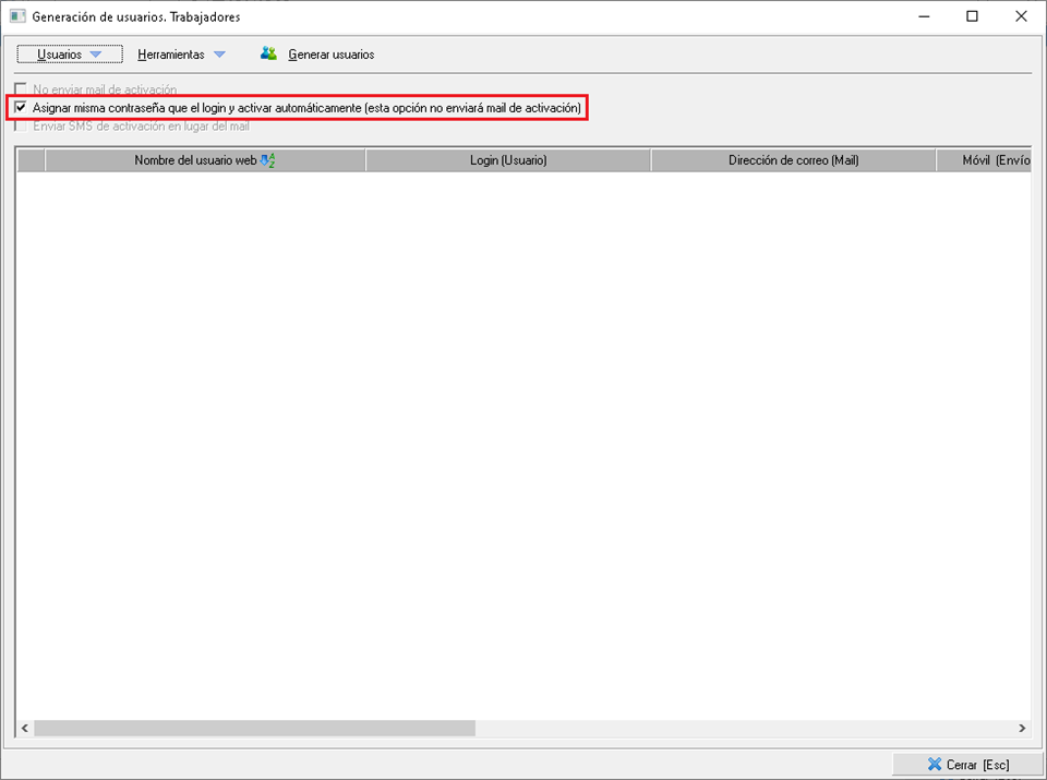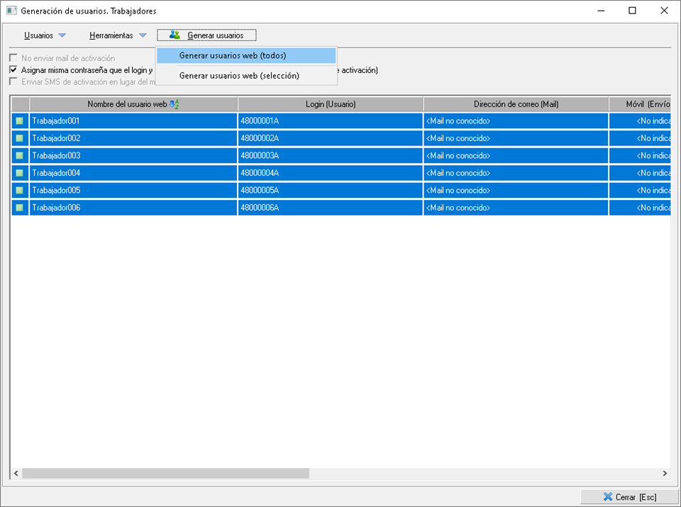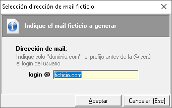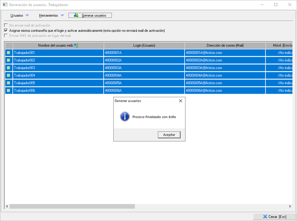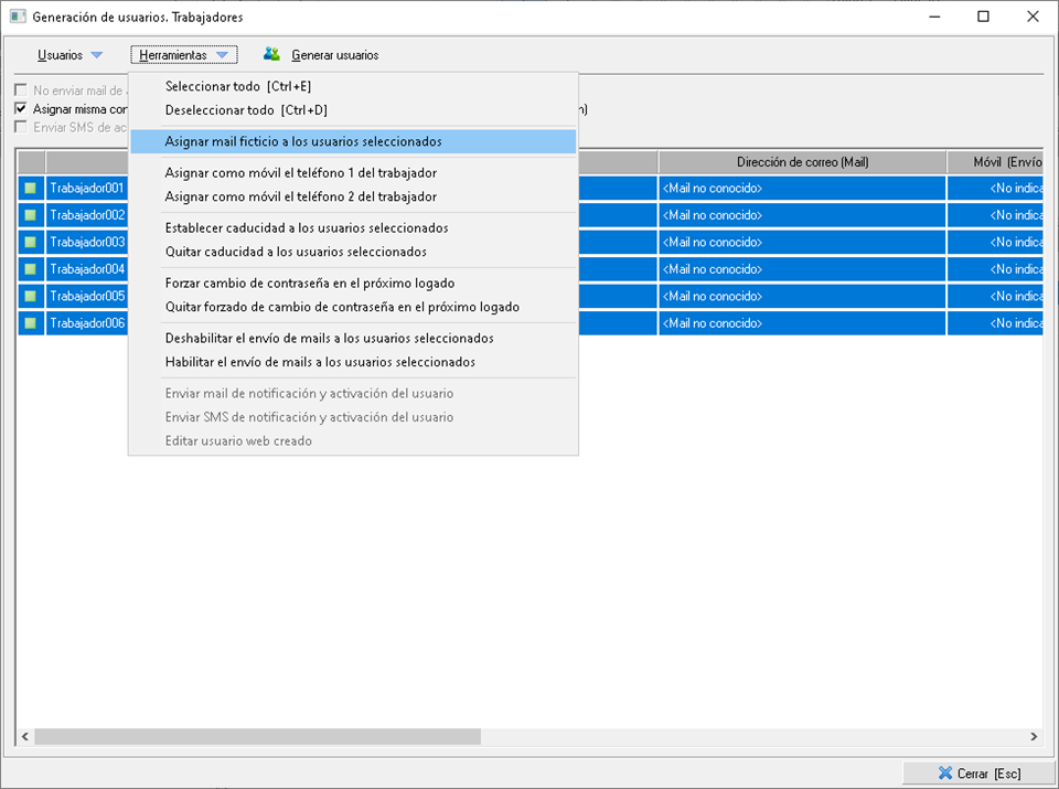 Tras la carga falta un dato obligatorio que es el e-mail de los trabajadores, por lo que tendrá que usar el menú Herramientas > Asignar mail ficticio a los usuarios seleccionados. Ésto combinará el login con el dominio que desee para crear la cuenta de correo, que por defecto es @ficticio.com.