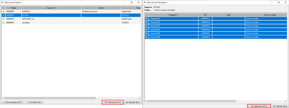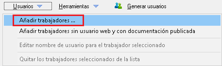 Use el menú Usuarios > Añadir trabajadores... para seleccionar la empresa ficticia, donde ha creado el estudio psicosocial, y los trabajadores ficticios que han de cumplimentar el cuestionario.