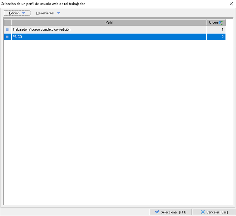 En el siguiente formulario debe seleccionar al perfil a asignar y pulsar el botón Seleccionar [F11].