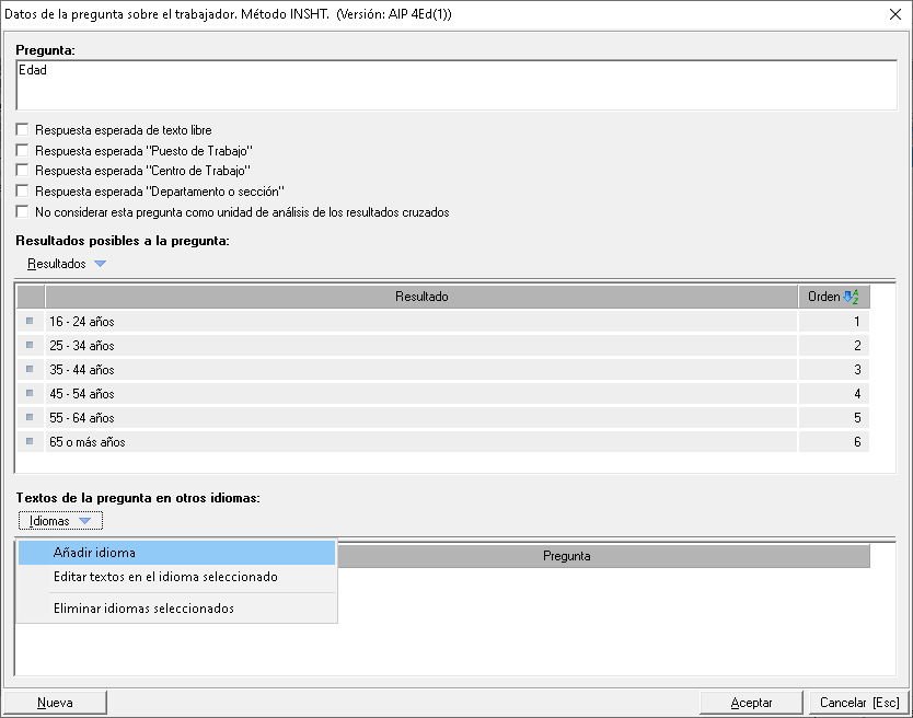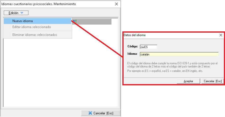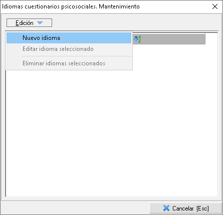 Para registrar los idiomas correspondientes debe usar el menú Mantenimientos > Evaluaciones de riesgo específicas > Psicosociología > Idiomas en el módulo TEC.