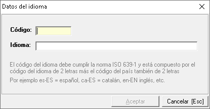 En el mantenimiento de idiomas debe usar el menú "Edición" -> "Nuevo idioma" para el registro de los mismos con el formulario correspondiente, donde los campos obligatorios son: