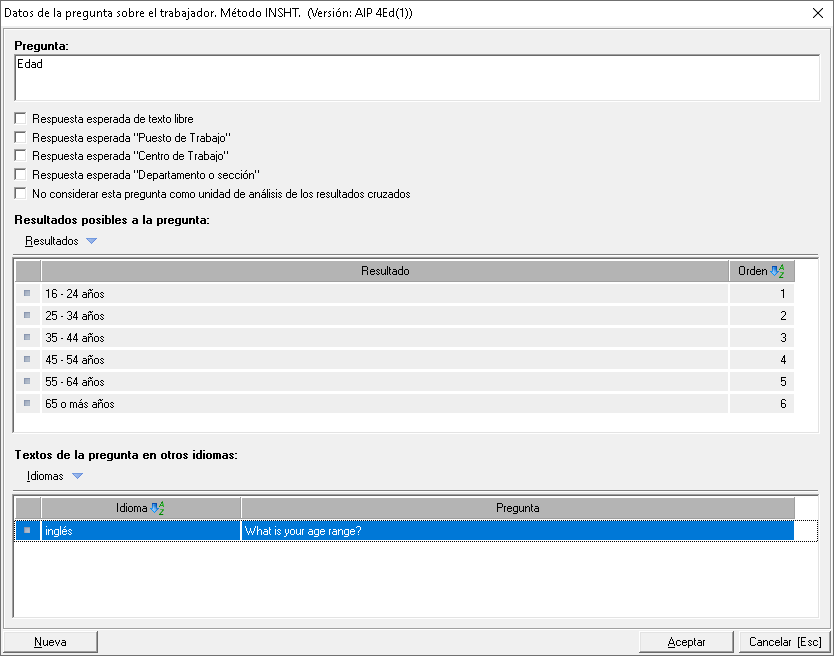 Y para traducir la preguntas y respuestas, ha de hacerlo tanto en la pestaña 2. Preguntas trabajador y pestaña 3. Preguntas cuestionario. Una vez situado en una pregunta, acceda a la ficha de la pregunta para poder traducirla. Tal y como se muestra en la siguiente imagen: