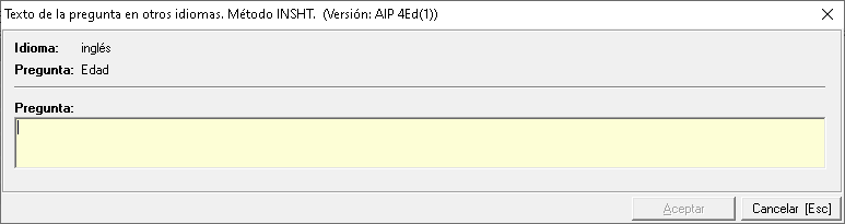Edite la ficha del método que desee traducir. Podrá traducir tanto la descripción del método, como las preguntas y sus respuestas. En la pestaña 1. Datos generales, podrá indicar la traducción de la descripción añadiendo en el apartado los idiomas que desee y el texto traducido. Es importante mencionar que traducir la descripción es necesario para que podamos seleccionar el idioma del cuestionario a la hora de cumplimentarlo con el ejecutable "CuestionarioPS.exe".