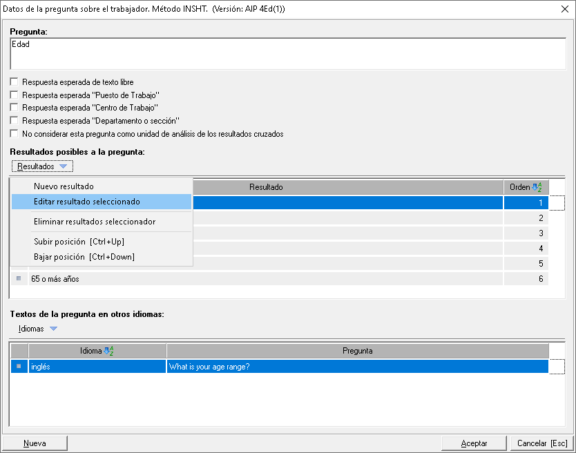 - Para traducir las posibles respuestas, editelas desde el menú Resultados > Editar resultado seleccionado para tener acceso al formulario de la respuesta y la puede traducir de la misma forma que se ha explicado anteriormente para las preguntas.