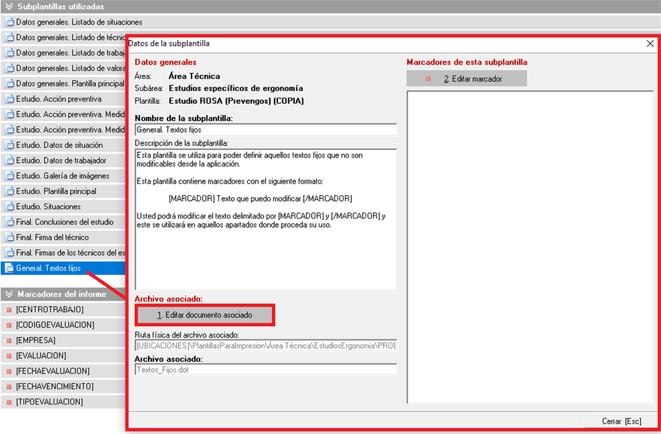 Para abrir el documento asociado se puede hacer doble click en la subplantilla y seleccionar “1. Editar documento asociado” o click derecho y “Editar documento asociado a la subplantilla seleccionada”.