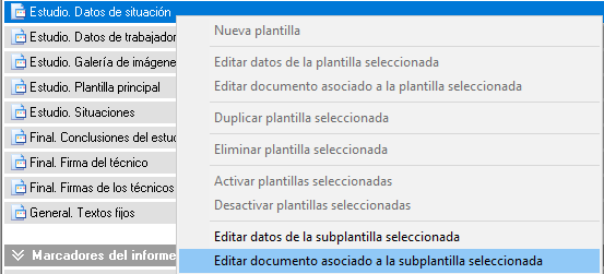 Es en todos los documentos asociados a cada una de las subplantillas donde sí existe texto plano, de modo que se tendrán que traducir individualmente cada una de de ellas. Para editar el documento asociado de cualquier subplantilla puede hacer click derecho sobre la subplantilla deseada y seleccionar dicha opción: