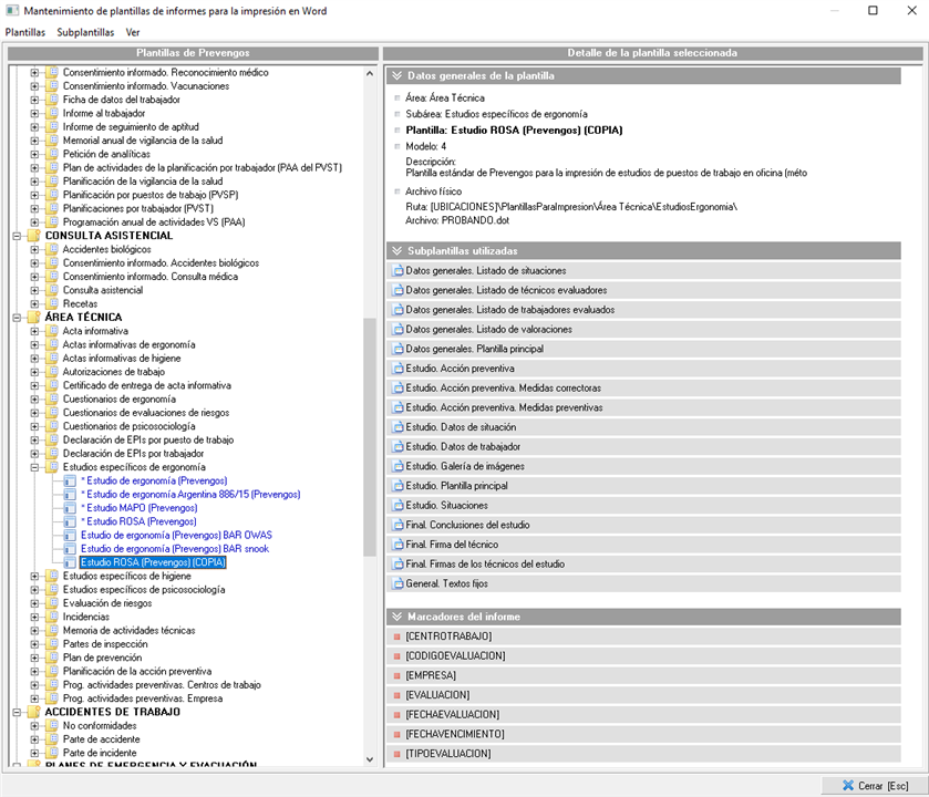 Una vez abierto, se seleccionará la deseada en el bloque “ÁREA TÉCNICA”, dentro de la carpeta “Estudios específicos de ergonomía”. Se recomienda duplicar la plantilla original de Prevengos para evitar errores indeseados, ya que una vez editada y guardada no hay ninguna opción que permita volver al estado original de la plantilla.