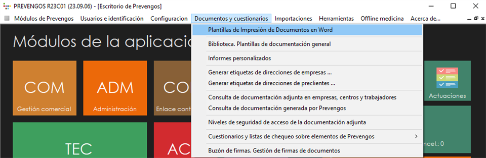 En esta parte, se ha de traducir el texto plano presente en la plantilla de impresión utilizada, es decir, todo aquello que no inserta un marcador. Además, se indicará el código del idioma en la subplantilla "General. Textos fijos", como se verá más adelante. Para llegar a ella, desde el escritorio de Prevengos, se ha de seleccionar “Documentos y cuestionarios” -> “Plantillas de Impresión de Documentos en Word”.