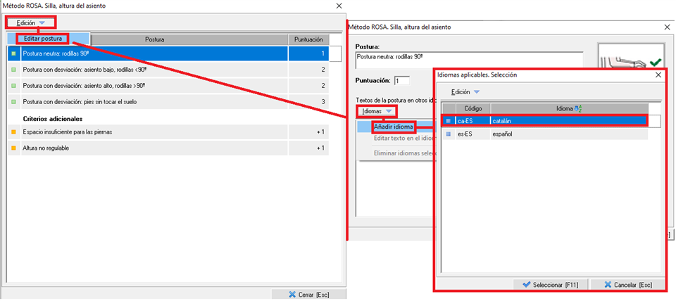 Se ejemplifica ahora el caso de traducir la “Postura neutra: rodillas 90” de la altura del asiento de la silla al catalán. Para ello abriremos el mantenimiento “Altura del asiento” habiendo seleccionado previamente “Silla de trabajo”. Con ello se abrirá su mantenimiento y se utilizarán los desplegables “Edición” e “Idiomas” tal y como se muestra en la secuencia de imágenes: