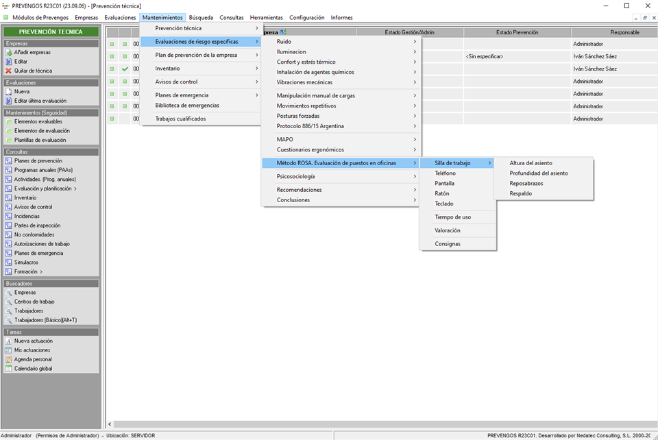 Para ello, en la pantalla principal del módulo técnico, deberá de seleccionar el menú superior “Mantenimientos” para desplegar las “Evaluaciones de riesgo específicas” y abrir las posturas del “Método ROSA. Evaluación de puestos en oficinas”. Con ello, deberá acceder a cada una de ellas para traducir el texto.