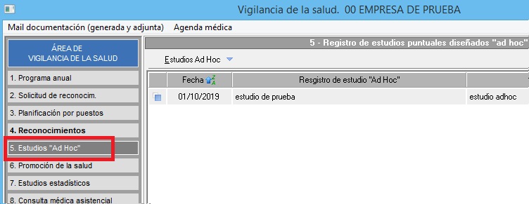 Gestiona el acceso a [Estudios “Ad Hoc”] dentro del área de vigilancia de la salud de la empresa, así como el acceso a la consulta de estudios “Ad Hoc”. Con RW el usuario puede acceder y crear/editar/eliminar registros, con R el acceso es solo lectura no pudiendo modificar datos y con D la herramienta esta deshabilitada. En la siguiente imagen mostramos donde se encuentra la herramienta a la que afecta este permiso.