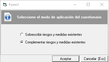 - Resumen del cuestionario. Esta ventana sólo aparece si se ha seleccionado un cuestionario configurado para evaluar un riesgo, en ella se mostrará el detalle del riesgo que se está evaluando con el cuestionario, los valores que toman las variables que se usan para valorar el riesgo (según el método utilizado) y la valoración que se aplicará al riesgo en función de las respuestas dadas al cuestionario.