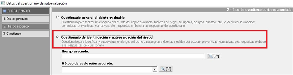 El usuario debe tener en cuenta que si el cuestionario está definido en el mantenimiento para la identificación y autoevaluación de un riesgo (como se muestra en la siguiente imagen), sólo podrá utilizar aquellos que estén configurados con el mismo método de evaluación que la evaluación de riesgos donde los vaya a utilizar.