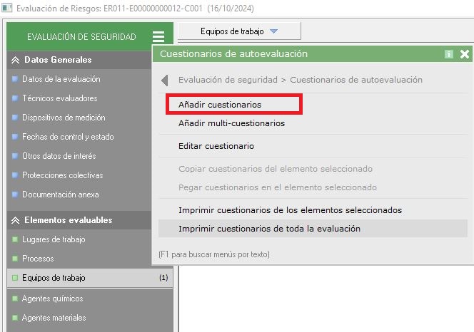 Para relacionar cuestionarios sobre un elemento de una evaluación, deben situarse en la ficha de datos de la evaluación de riesgos, y en el apartado del panel izquierdo en el que se encuentra el elemento sobre el que quieren aplicar el cuestionario (equipo de trabajo, puesto de trabajo...).