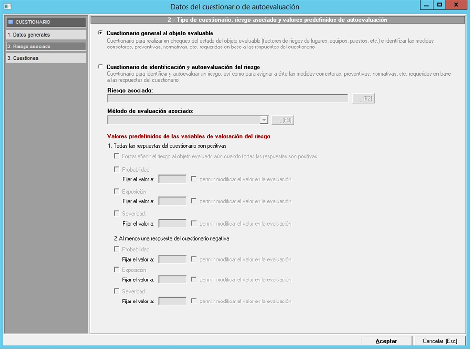 - Cuestionario de identificación y evaluación del riesgo. Tendrán que seleccionar esta opción en aquellos cuestionario que quiera utilizar para evaluar un riesgo concreto del elemento sobre el que se aplique el cuestionario. Una vez seleccionada esta opción, el usuario tendrá que indicar el riesgo que se va a evaluar y el método que se va a usar para evaluar dicho riesgo.