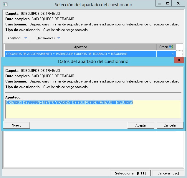 - Cuestionario general al objeto evaluable. Si el usuario selecciona esta opción, estará indicando que el cuestionario se aplica de forma general sobre el elemento al que se relaciona (equipos, puestos, etc.). En este caso, no se añadirá ni se evaluará ningún riesgo sobre dicho elemento, pero si existirá la opción de que sobre ese elemento, se añada información como medidas preventivas, correctoras, EPIs, señales, formación e información. Esto último dependerá de cómo se configure el apartado '2.3. Cuestiones'.