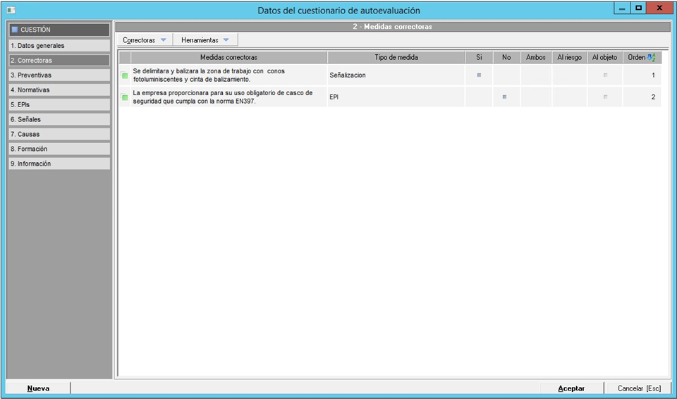 Dentro de la ficha de datos de la pregunta, el usuario encontrará un apartado para cada uno de los tipos de datos que podrá añadir al elemento evaluado. Vamos a explicar sólo uno de estos apartados (medidas correctoras) ya que la configuración en ellos es exactamente igual, la única diferencia es el tipo de dato que se va a añadir al elemento evaluable.