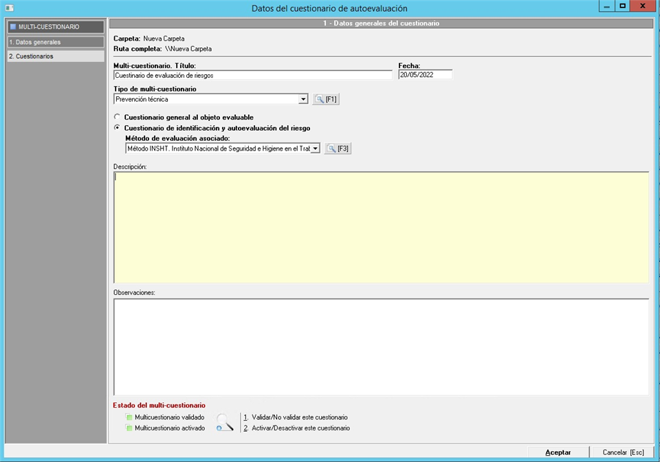 En este apartado habrá que indicar también si el multicuestionario va a incluir cuestionarios 'generales' o cuestionarios para identificación y evaluación de riesgos. Además, si se va a usar para identificación y evaluación de riesgos, habrá que indicar el método que se quiere utilizar, esto es importante, porque en caso de que los cuestionarios vayan a evaluar riesgos, sólo podrán utilizarse en evaluaciones en las que se aplique el mismo método de evaluación seleccionado.