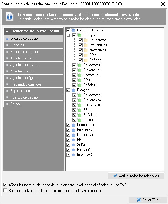 Dentro de este apartado veremos todos aquellos tipos de elementos que podemos evaluar, estando formado por los lugares de trabajo, procesos, equipos de trabajo, agentes químicos, agentes materiales, agentes físicos, agentes biológicos, preparados químicos, exposiciones, puestos de trabajo y tareas.