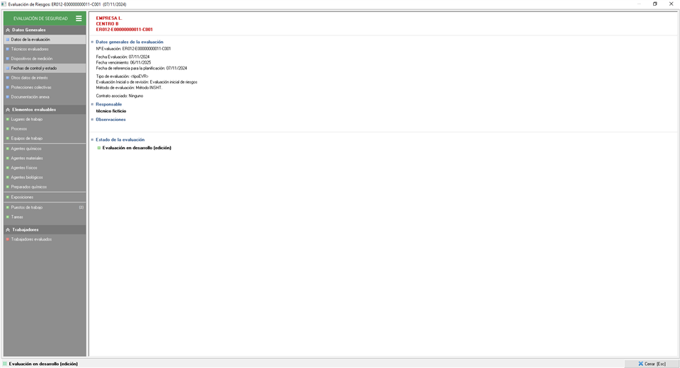 Dentro de este primer apartado de la evaluación encontraremos los apartados referentes a Datos de la empresa, centro de trabajo y evaluación, técnicos evaluadores, dispositivos de medición, fechas de control y estado, otros datos de interés, protecciones colectivas y, por último, documentación anexa.