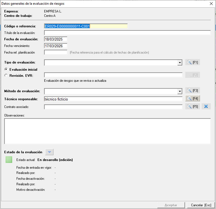 Además, podemos indicar el contrato asociado a la realización de esta evaluación de riesgos siempre que tengamos contratado el módulo de administración, esta información es solo informativa. Por último, tenemos el campo de observaciones donde podremos indicar diferentes detalles sobre la propia evaluación que no tenga cabida en otro campo. En la parte inferior se nos indica el estado en el que está la propia evaluación (en desarrollo, vigente o desactivada), el motivo es porque esta misma ventana se puede consultar en cualquier momento, no solo cuando vayamos a crear la evaluación.