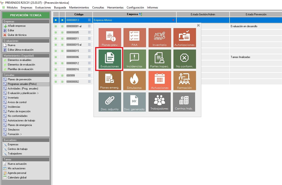 En este manual vamos a ver como accedemos al área de evaluaciones de riesgos y creamos una nueva evaluación de seguridad, entrando al detalle en todas aquellas pestañas que nos encontramos en la propia ventana de la evaluación. Para ello, accederemos al área técnica de Prevengos y, dentro de esta, entraremos a la ficha de la empresa a la que le vamos a realizar la EVR.
