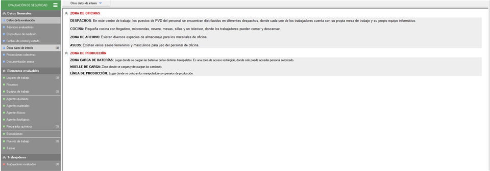 Dentro de esta pestaña podremos añadir todos aquellos datos que consideremos deben de estar presentes en la evaluación de riesgos pero no tienen cabida en otro apartado. La forma de crearlo dentro de esta herramienta sería con la creación de Apartados y Datos de interés (menús que podremos visualizar al pulsar sobre el desplegable