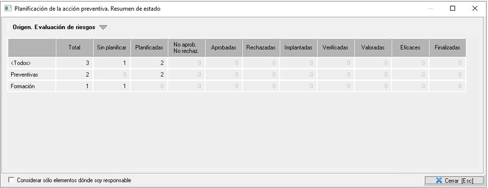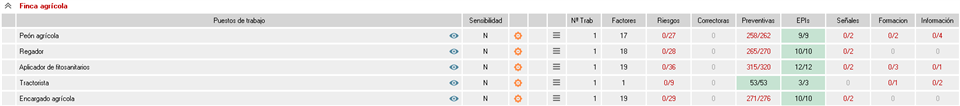 - Correctoras; Preventivas; EPIs; Señales; Formación; Información. Número de elementos de la planificación preventiva asociados al elemento evaluado, al igual que en los riesgos, se muestran dos números, el de la derecha corresponde al número total de elementos vinculados, mientras que el de la izquierda es el número de registros finalizados.
