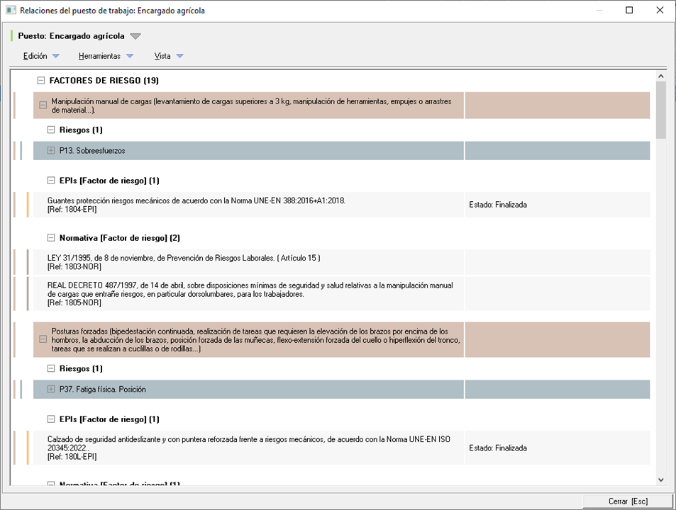 - Naranja. Relaciones del puesto de trabajo pendientes o sin finalizar. (Riesgos sin evaluar, elementos de la planificación sin finalizar...)