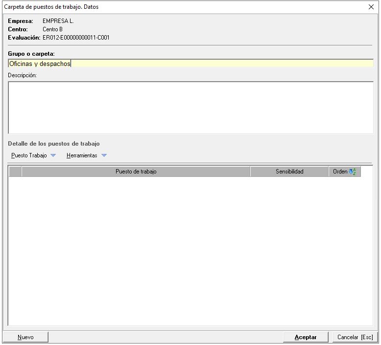 En el caso de los lugares de trabajo, existe una pequeña diferencia con respecto al resto de elementos evaluables. Como hemos comentado en el apartado anterior, para evaluar un puesto, primero hay que añadir una 'Carpeta o grupo' y a continuación, incluimos los puestos a evaluar. Para los lugares de trabajo, el grupo o carpeta es en realidad el lugar de trabajo, por lo que en vez de añadir una carpeta o grupo, añadirán directamente el lugar, para ello en el apartado de 'Lugares de trabajo' utilizarán el desplegable 'Lugares Trab.' para crear un nuevo lugar.