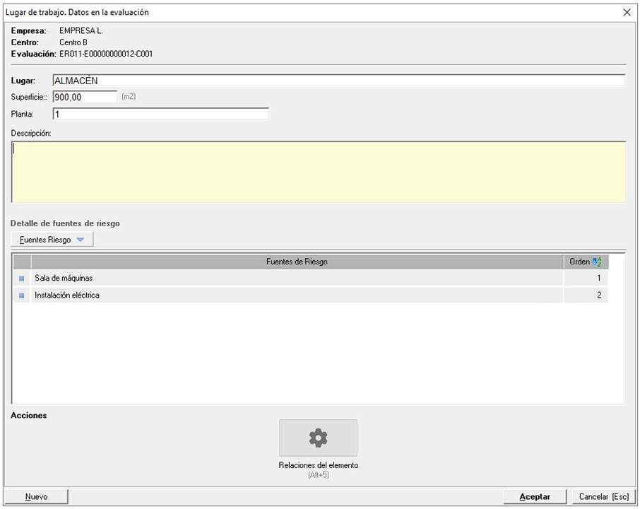 La ficha de datos del lugar, es similar a la de un grupo o carpeta, como mínimo deberán indicar el nombre del lugar, aunque dispones de campos para indicar la superficie y planta (estos son informativos). Una vez creado el lugar, se añadirán las instalaciones o fuentes de riesgo del lugar, que serán los elementos que se van a evaluar. Para añadir instalaciones, se usará el desplegable