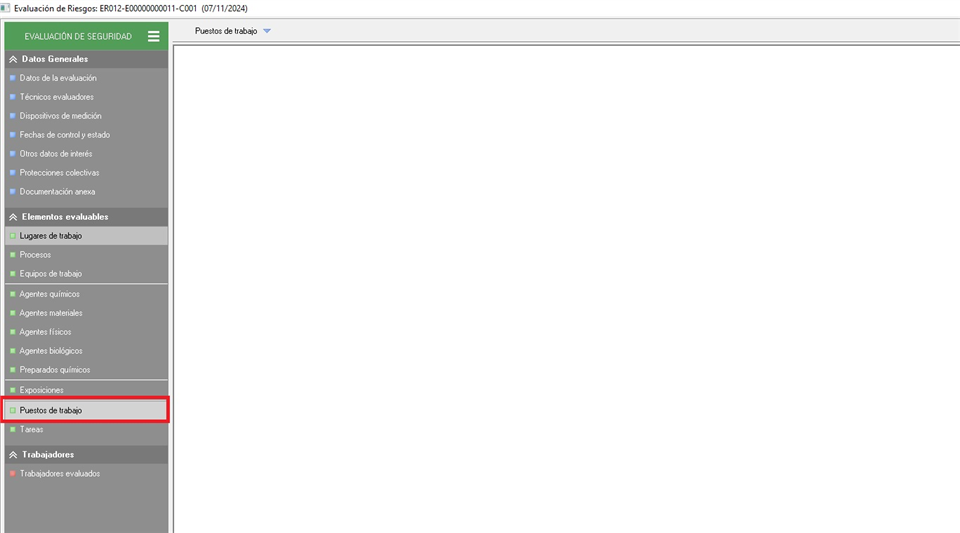 Para incluir un elemento evaluable (en adelante, puesto de trabajo) en una evaluación de riesgos, el usuario debe acceder a la evaluación y situarse en el apartado correspondiente al elemento que quiere añadir, en este caso un puesto de trabajo.