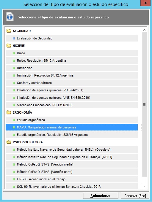 Una vez que se encuentra en el apartado de 'Evaluaciones de riesgos' deberá usar el desplegable 'Evaluaciones' o pulsar sobre el listado de evaluaciones con botón derecho del ratón, y pulsar sobre la opción 'Nueva evaluación de riesgos'. En ese momento, se le pedirá el centro de trabajo sobre el que desea hacer el estudio (si está ya en la ficha de datos del centro, no aparecerá este formulario). Después de seleccionar el centro de trabajo, se mostrará otro formulario en el que tendrá que seleccionar el tipo de evaluación que desea crear, en este caso el 'MAPO. Manipulación manual de personas'.