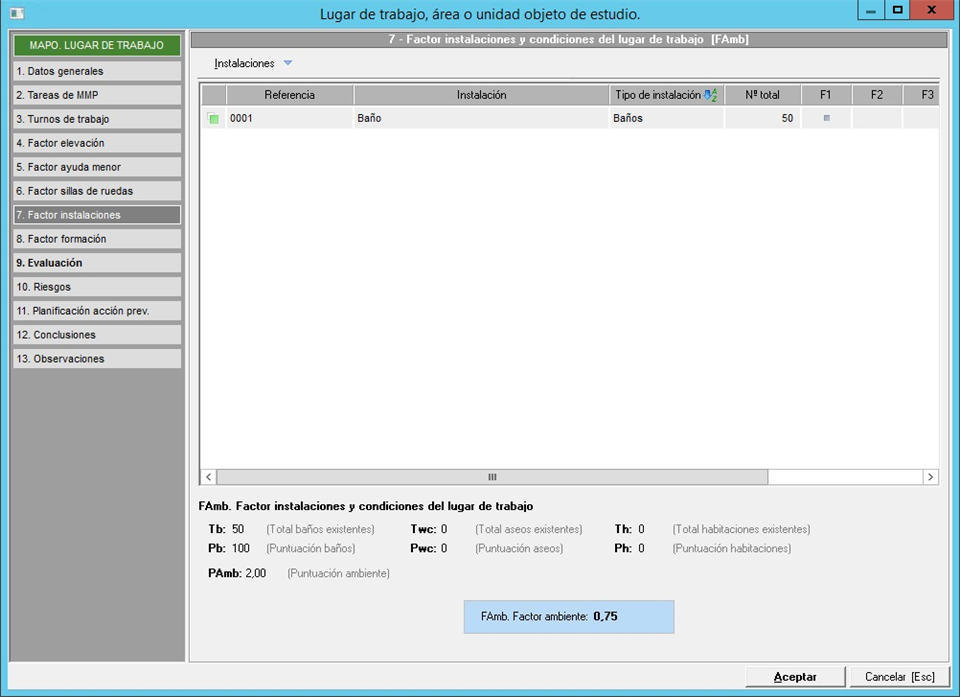 Una vez indicados estos datos, Prevengos calculará y mostrará el factor ambiente o de instalaciones y condiciones del lugar de trabajo (FAmb) que se aplicará en el cálculo de la valoración del lugar.