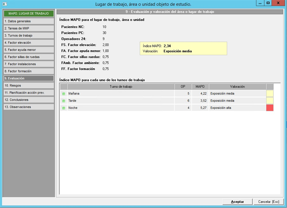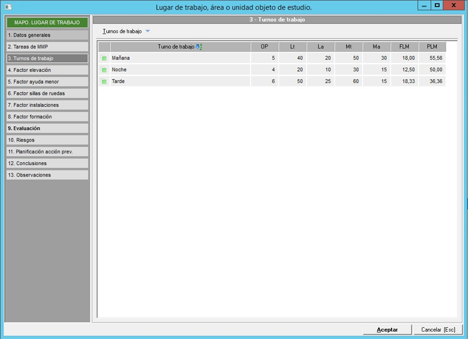 Una vez cumplimentados los apartados definidos en los puntos anteriores, al acceder a este apartado, se mostrará la valoración del lugar aplicando los datos y factores calculados en el resto de apartados. En esta pantalla de valoración encontraremos dos bloques, en la parte superior se mostrará la valoración global del lugar, mientras que en la parte inferior, se mostrará el listado de turnos de trabajo definidos en el lugar con una valoración independiente de cada turno de trabajo.