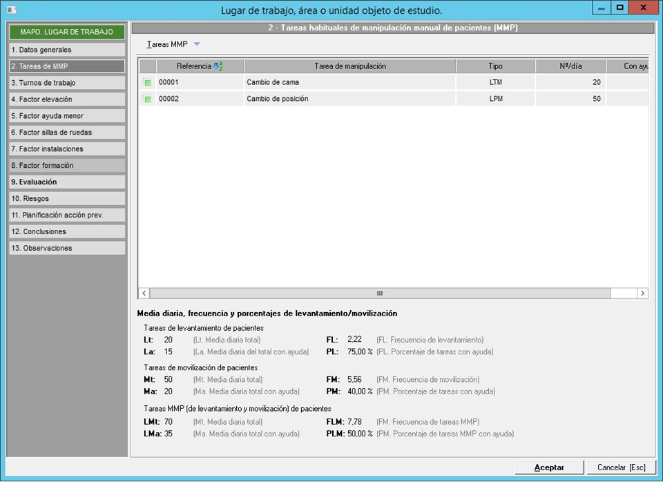 En este punto se detallarán las tareas de manipulación manual de pacientes que se llevan a cabo en el lugar de trabajo evaluado. Desde el menú desplegable 'Tareas MMP' añadirán las tareas desde un mantenimiento, en el que podrán definir tareas de 'Levantamiento total' (LTM) y tareas de 'Movilización o levantamiento parcial' (LPM).