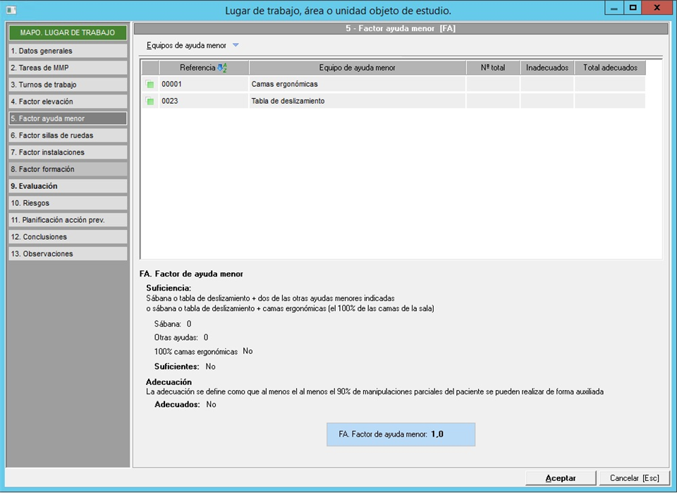 Una vez indicados estos datos, Prevengos calculará y mostrará el factor de ayuda menor (FA) que se aplicará en el cálculo de la valoración del lugar.