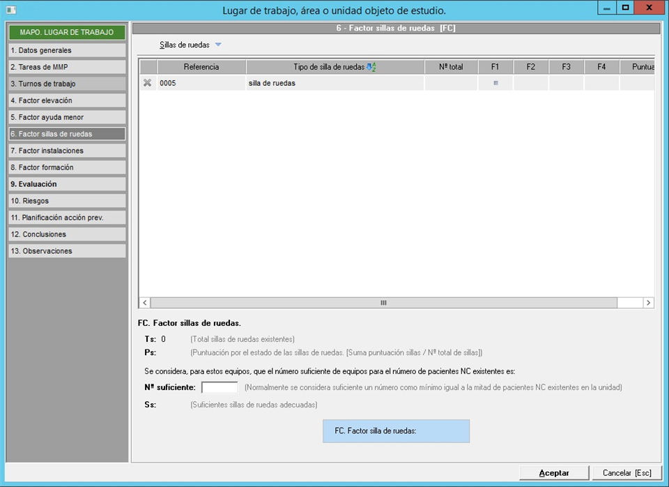 Una vez indicados estos datos, Prevengos calculará y mostrará el factor de silla de ruedas (FC) que se aplicará en el cálculo de la valoración del lugar.